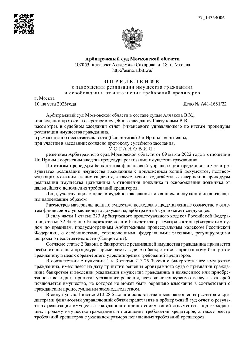 Радостная новость для еще одного клиента компании "ДОЛГАМ.НЕТ"! 10 августа 2023 года Арбитражный суд Московской области принял решение по делу №А41-1681/2022: завершил процедуру реализации имущества и освободил гражданина от исполнения требований кредиторов.
