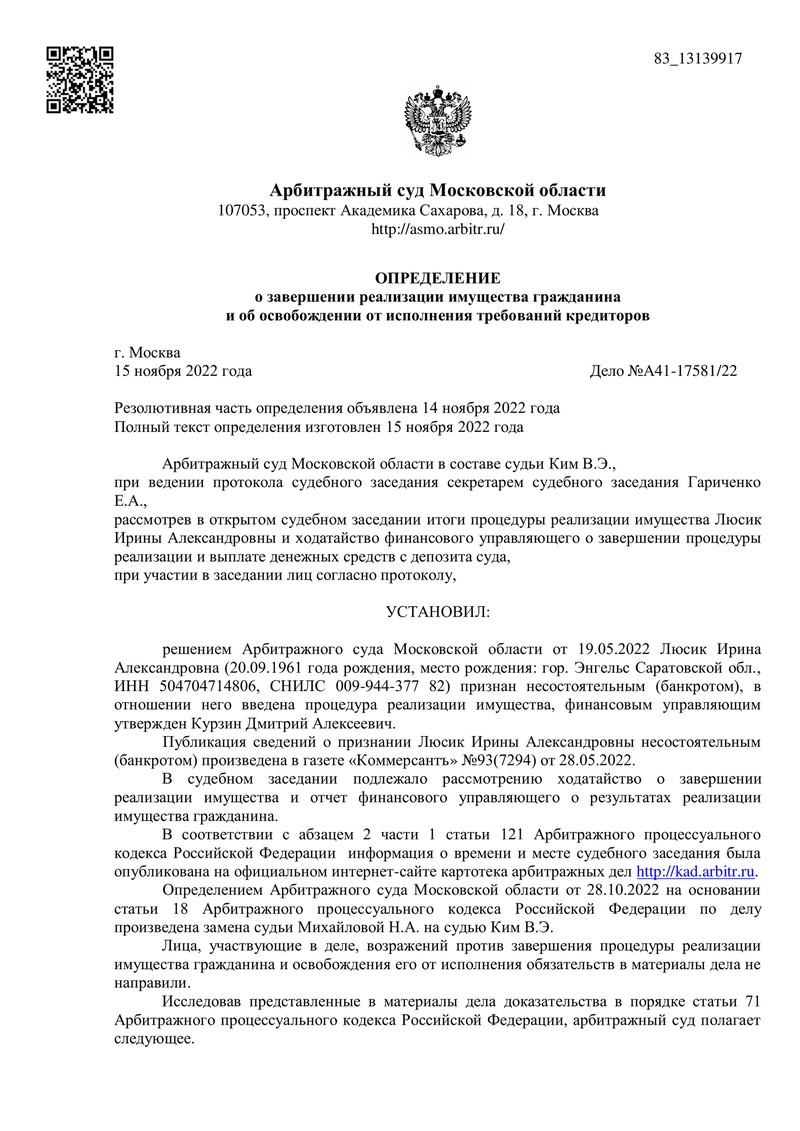 Арбитражный суд Московской области завершил процедуру банкротства и освободил от долгов еще одного клиента компании "ДОЛГАМ.НЕТ".