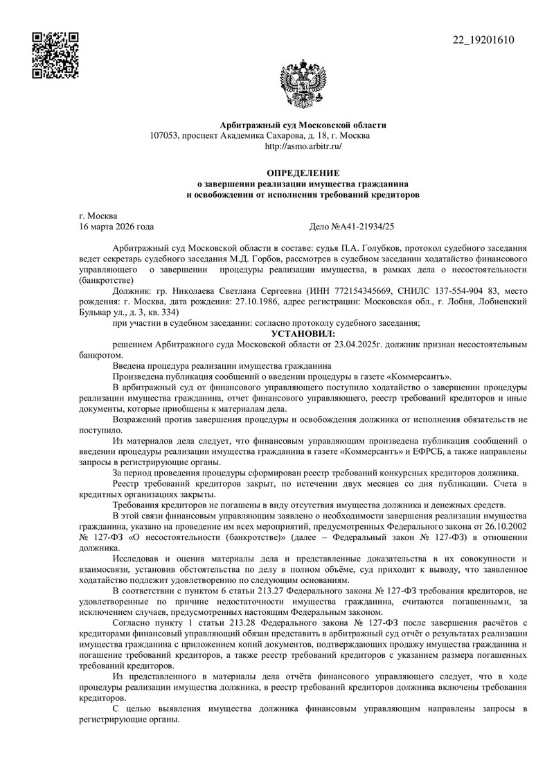 Еще одно выигранное дело в практике "ДОЛГАМ.НЕТ"! Арбитражный суд Московской области завершил процедуру реализации имущества гражданина и применил правило об освобождении от дальнейшего исполнения требований кредиторов. Определение вынесено 16 марта 2026 года.