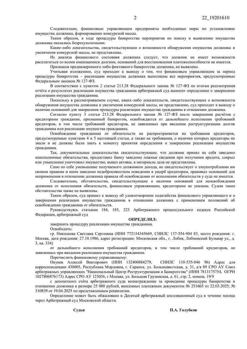 - Судебный акт: определение о завершении реализации имущества и освобождении от требований кредиторов