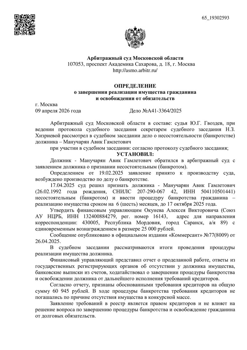 В деле № А41-3364/2025 Арбитражный суд Московской области поставил финальную точку в процедуре банкротства гражданина: 09 апреля 2026 года судья Ю.Г. Гвоздев вынес определение о завершении реализации имущества и об освобождении гражданина от дальнейшего исполнения требований кредиторов. Для нашего клиента это означало главное — законное прекращение долгового бремени и завершение всех судебных формальностей.