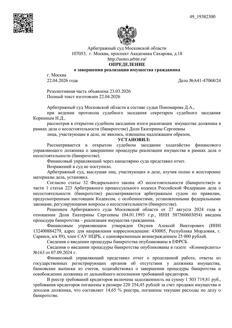 Огромная благодарность ООО «ДОЛГАМ.НЕТ» за помощь в банкротстве физического лица. Благодарю Альберта Калмыкова, Ангелину Волкову, Артема Волкова, Тараса Чекашкина, Елену Польдяеву и, конечно, Екатерину Карякину. Спасибо вам за то, что помогли разобраться с долгами, с которыми я уже не знала, что... Подробнее