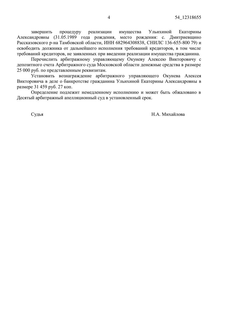 5 мая 2022 года Арбитражный суд Московской области вынес определение о завершении процедуры реализации имущества и об освобождении должника от дальнейшего исполнения требований кредиторов по делу №А41-5859/2021.