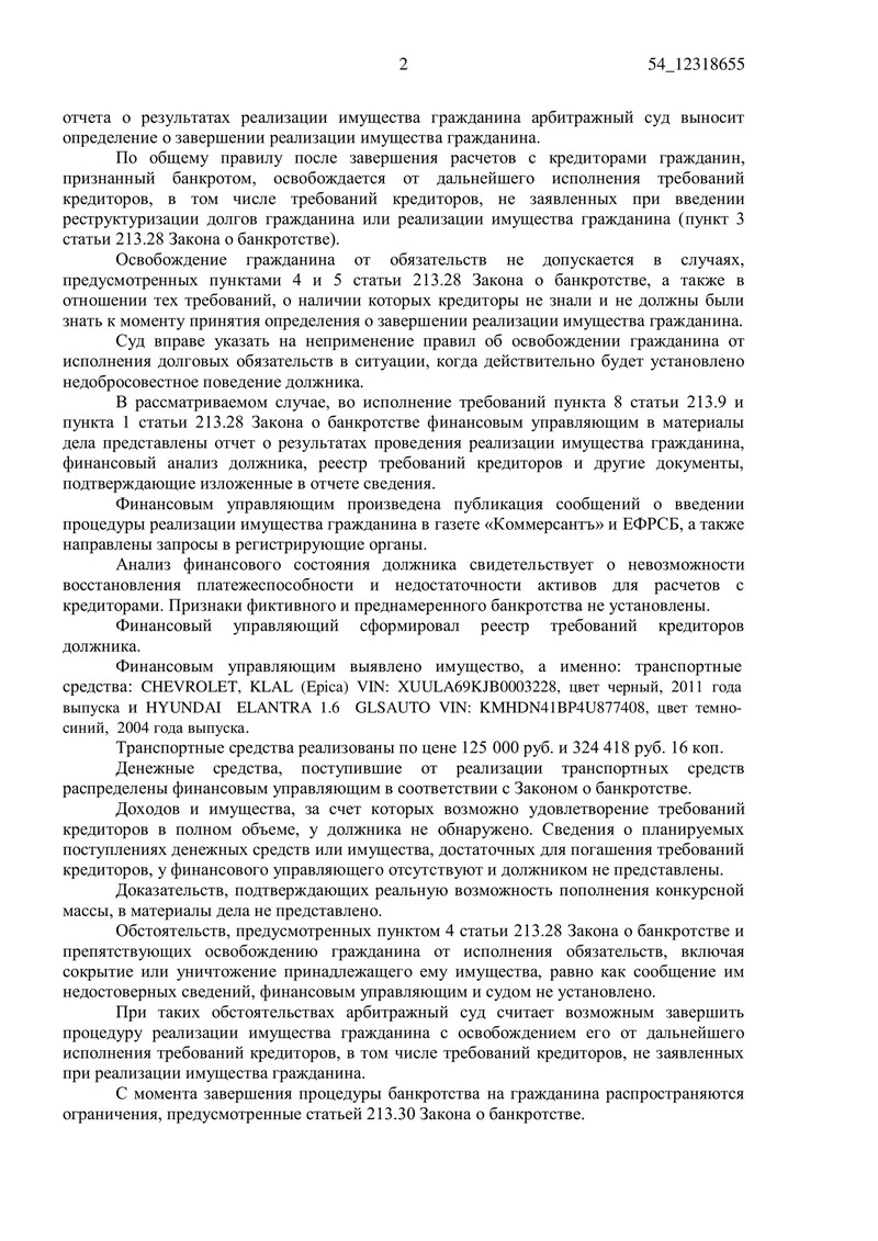 В ходе судебного разбирательства было обнаружено имущество, а именно два автомобиля: Chevrolet Epica 2011 года выпуска и Hyundai Elantra 2004 года выпуска, которые были реализованы на общую сумму 449 418 рублей 16 копеек. Все вырученные средства были распределены среди кредиторов в соответствии с Законом о банкротстве, но, несмотря на это, оставались долги, которые невозможно было погасить из-за отсутствия других активов и доходов у должника.