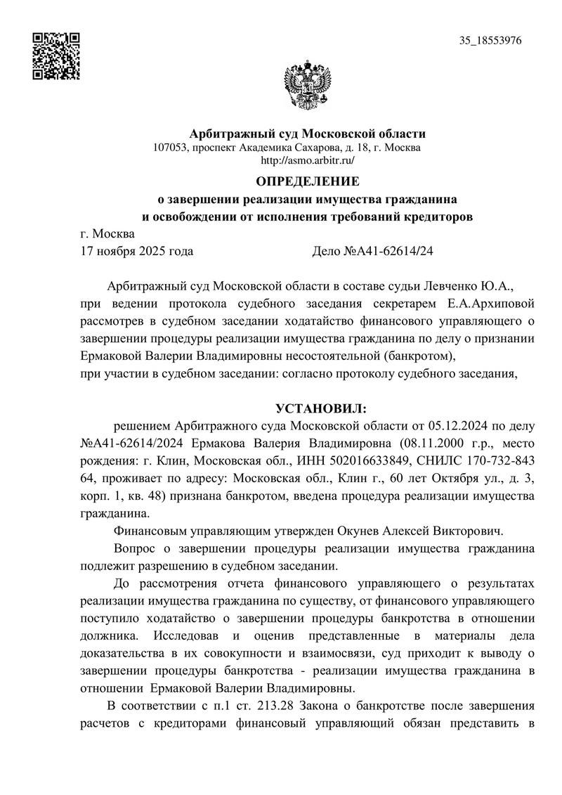 Арбитражный суд Московской области завершил процедуру реализации имущества по делу № А41-62614/2024 и официально освободил нашего клиента от дальнейшего исполнения требований кредиторов. Это очередной доказанный в суде успех команды ДОЛГАМ.НЕТ и новый счастливый клиент, избавившийся от долгового бремени.