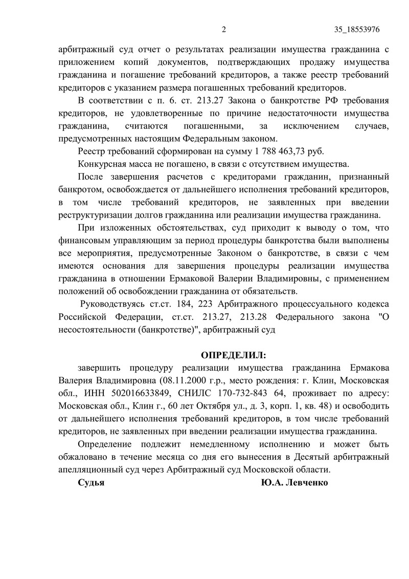 - Все мероприятия, предусмотренные законом, финансовый управляющий выполнил в полном объёме. Об этом свидетельствует положительный итоговый отчёт финансового управляющего и его ходатайство о завершении процедуры.