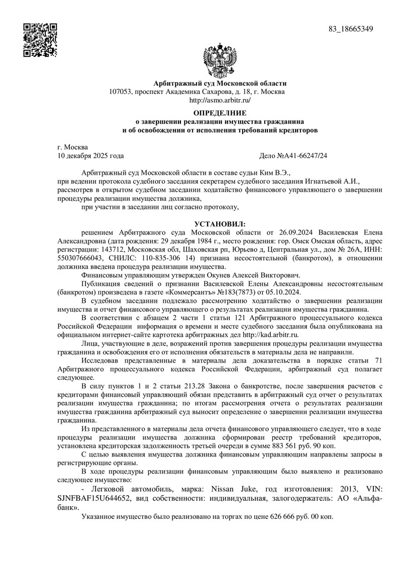 В ходе процедуры был выявлен и реализован на торгах легковой автомобиль Nissan Juke (2013 г.в.), находившийся в залоге у АО «Альфа-Банк». Автомобиль продан за 626 666 руб. Поступившие средства финансовый управляющий распределил в соответствии с требованиями Федерального закона №127-ФЗ "О несостоятельности (банкротстве)".
