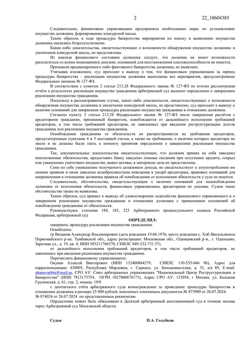 - Суд не выявил признаков преднамеренного или фиктивного банкротства.