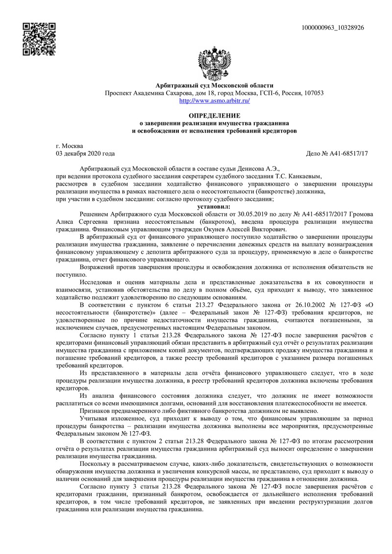 03 декабря 2020 года Арбитражный суд Московской области завершил процедуру реализации имущества и освободил клиента компании "ДОЛГАМ.НЕТ" от исполнения требований кредиторов. Процедура банкротства по делу №А41-68517/2017 началась еще 30 мая 2019 года и в итоге позволила нашему клиенту избавиться от долгов при помощи юридических инструментов на законных основаниях.