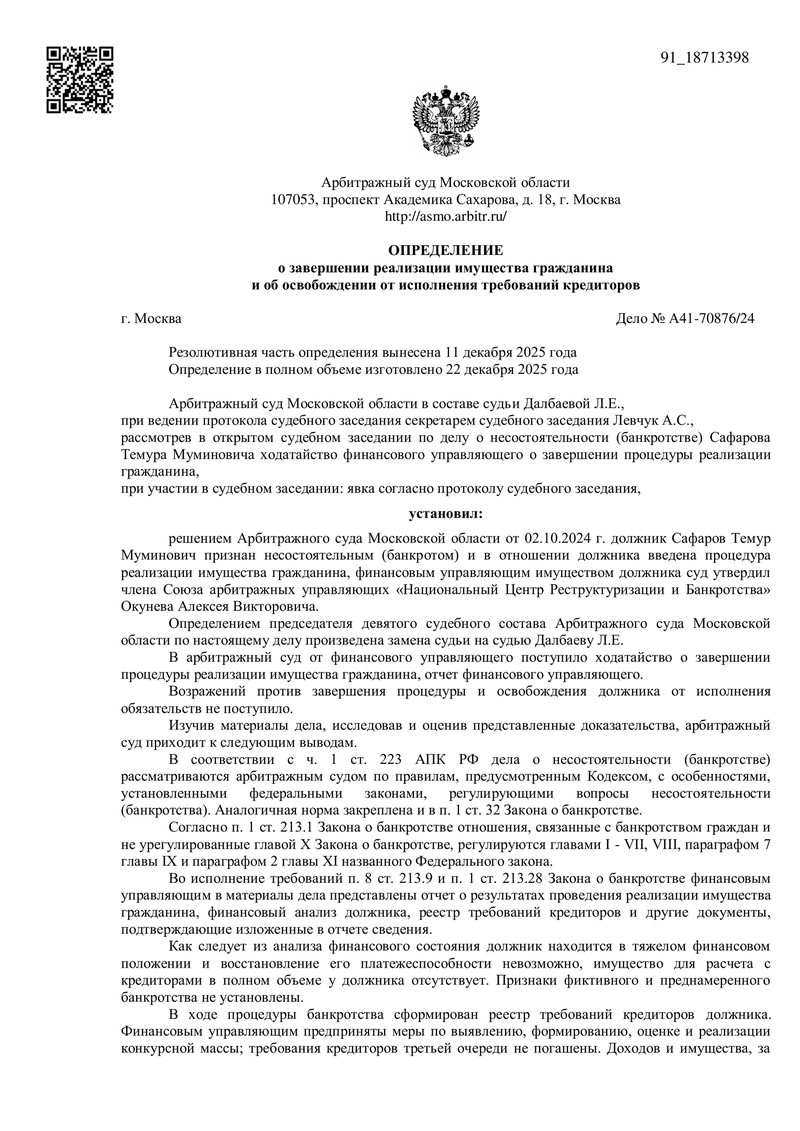 Очередная успешная история в практике "ДОЛГАМ.НЕТ". Арбитражный суд Московской области поставил точку в процедуре банкротства гражданина и освободил его от дальнейшего исполнения требований кредиторов. Резолютивная часть определения объявлена 11 декабря 2025 года, а полный текст изготовлен 22 декабря 2025 года. Для нашего клиента это означает законный выход из долгового лабиринта и возможность начать финансовую жизнь заново без давления старых обязательств. И именно ради такого результата команда "ДОЛГАМ.НЕТ" и ведет каждое дело.