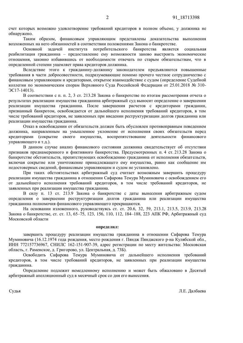 Определение подлежит немедленному исполнению и может быть обжаловано в Десятый арбитражный апелляционный суд в 30-дневный срок со дня вынесения. Полномочия финансового управляющего прекращаются с даты вынесения судом определения о завершении процедуры.