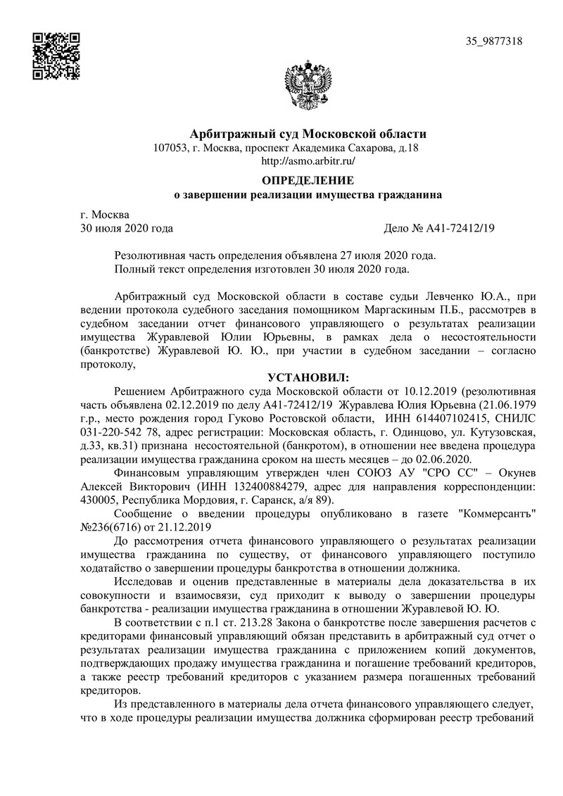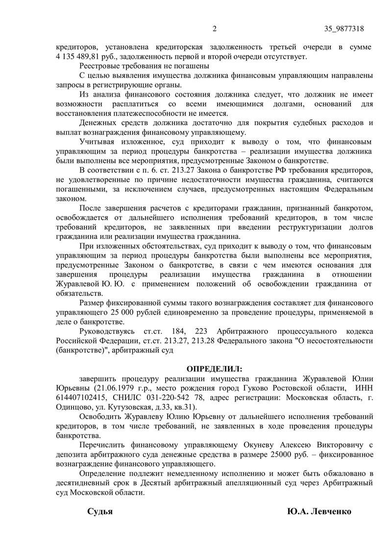 Дело №А41-72412/2019 началось 2 декабря 2019 года. В процессе банкротства был сформирован реестр требований кредиторов на сумму 4 135 489 рублей. Однако несмотря на все усилия финансового управляющего обязательства не были погашены. Это подтолкнуло суд к выводу о невозможности восстановления платежеспособности должника.
