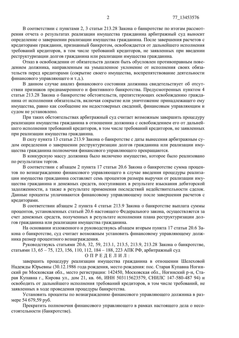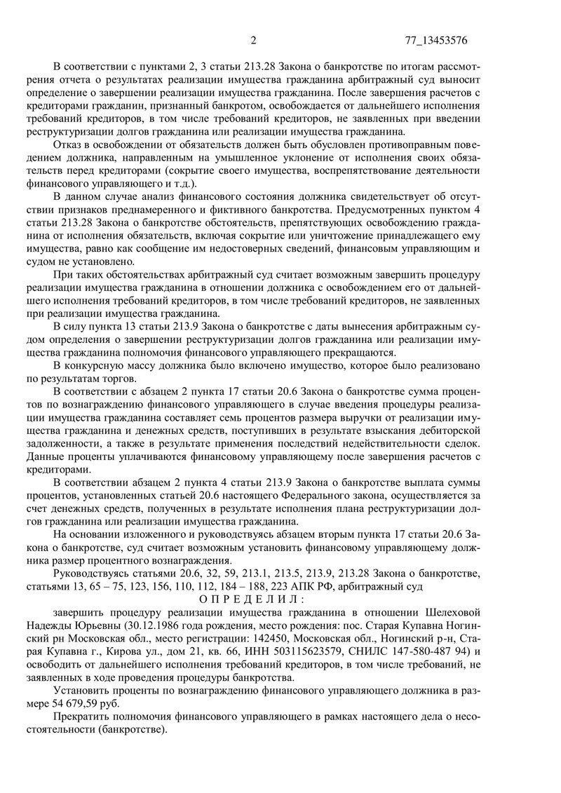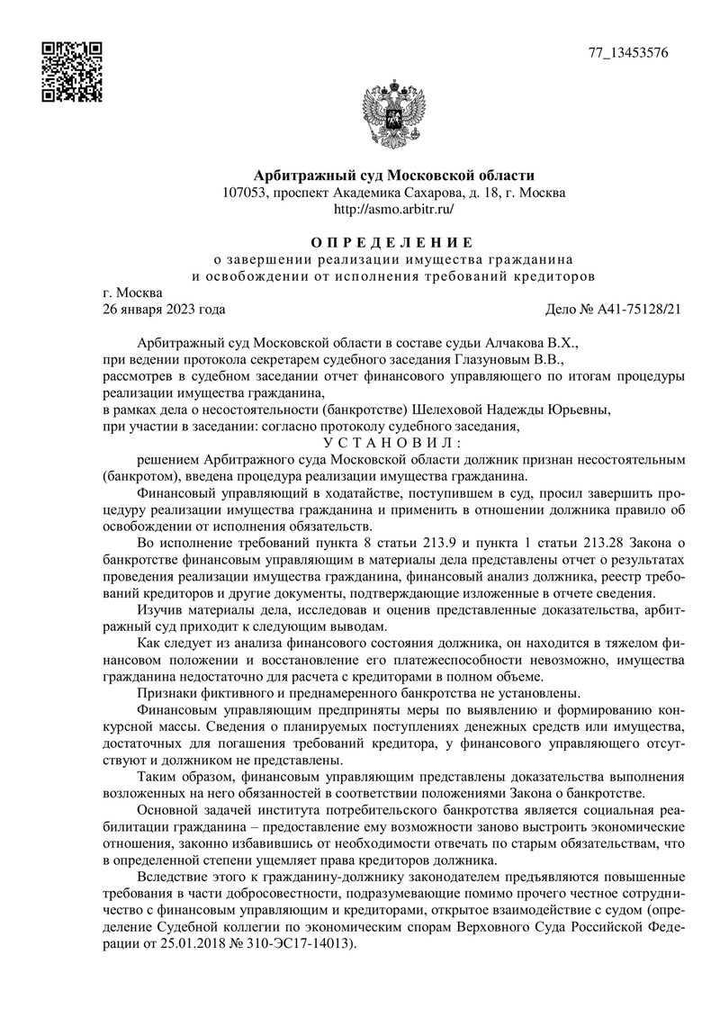 Судебное определение подлежит немедленному исполнению, что означает, что наш клиент освобожден от дальнейшего исполнения требований кредиторов. В течение десяти дней решение можно обжаловать в Десятом арбитражном апелляционном суде.
