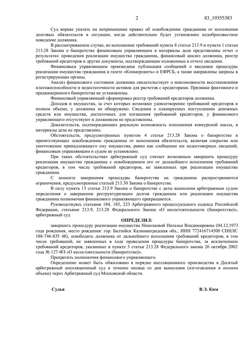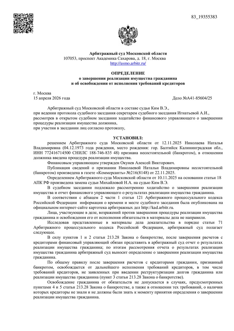 По итогам рассмотрения материалов дела 15.04.2026 судья Ким В.Э. вынес судебный акт: суд определил завершить процедуру реализации имущества гражданина и освободить должника от дальнейшего исполнения требований кредиторов, включая требования, не заявленные в ходе банкротства (за исключением требований, прямо указанных в статье 213.28 Закона № 127-ФЗ). Также суд определил прекратить полномочия финансового управляющего.