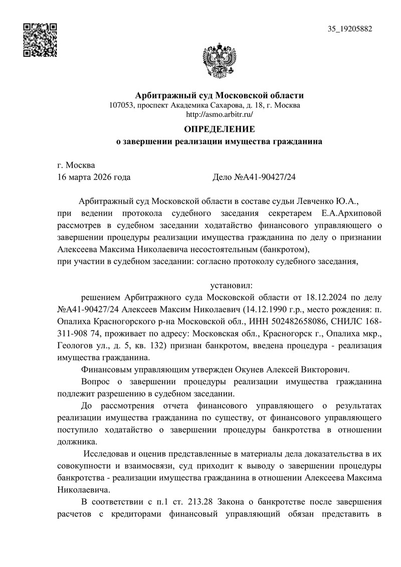 Дело № А41-90427/2024: Арбитражный суд Московской области завершил банкротство гражданина и освободил от долгов