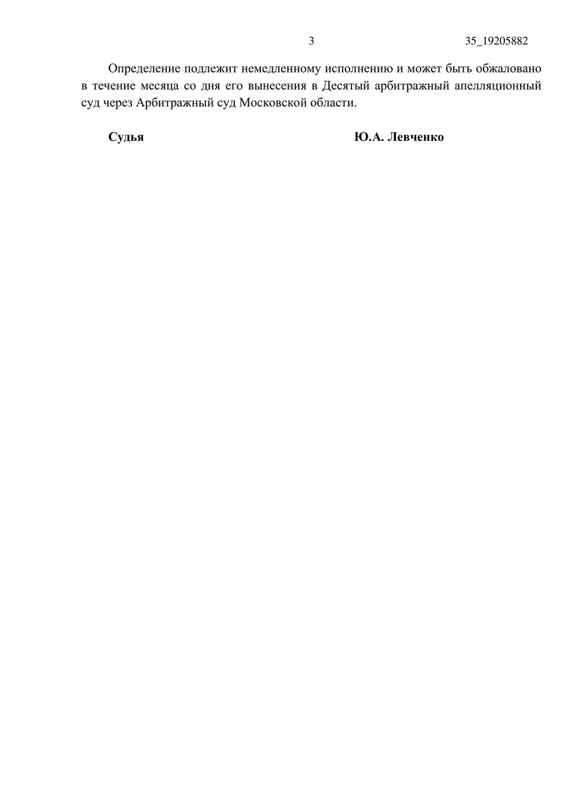 Определение подлежит немедленному исполнению и может быть обжаловано в течение месяца в Десятый арбитражный апелляционный суд через Арбитражный суд Московской области.