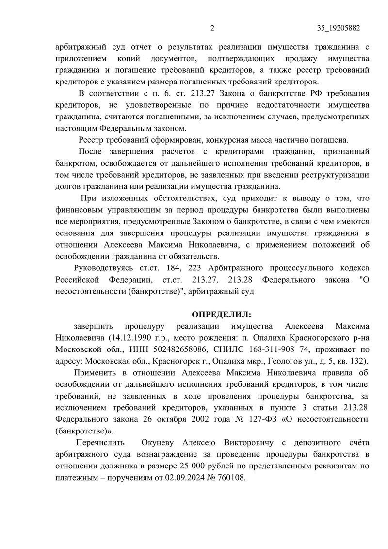 Отдельно суд определил перечислить финансовому управляющему вознаграждение 25 000 руб. с депозитного счета суда по платежному поручению от 02.09.2024 № 760108.