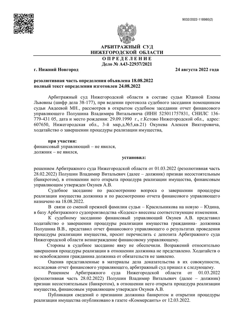 Финансовый управляющий в процедуре реализации имущества своевременно представил отчет о результатах своей работы, который был рассмотрен на судебном заседании 18 августа 2022 года.