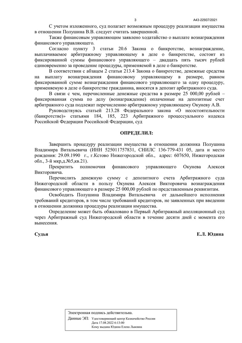 Суд изучил все представленные материалы и доказательства, принял решение завершить процедуру реализации имущества. Полномочия финансового управляющего были прекращены.