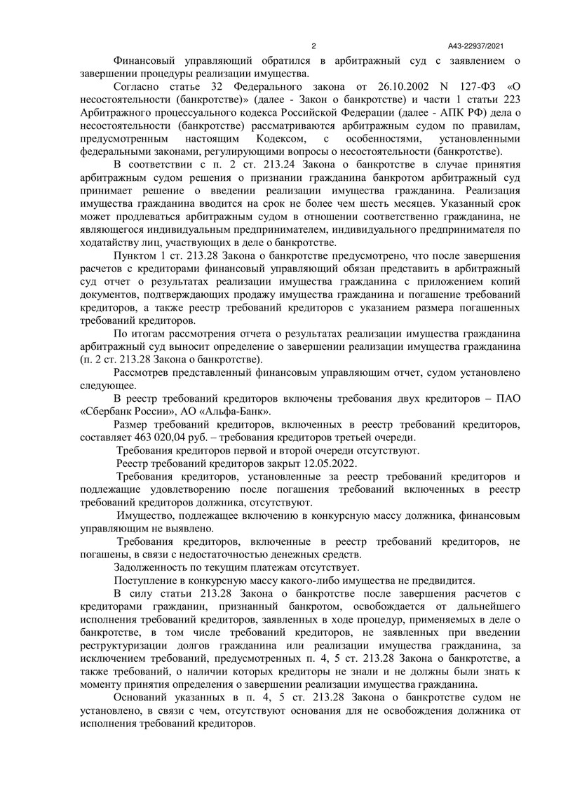 Процедура банкротства была инициирована по заявлению должника вследствие невозможности удовлетворить требования кредиторов. Общая сумма его долгов составляла 463 020 рублей, а основными кредиторами являлись ПАО "Сбербанк России" и АО "Альфа-Банк".