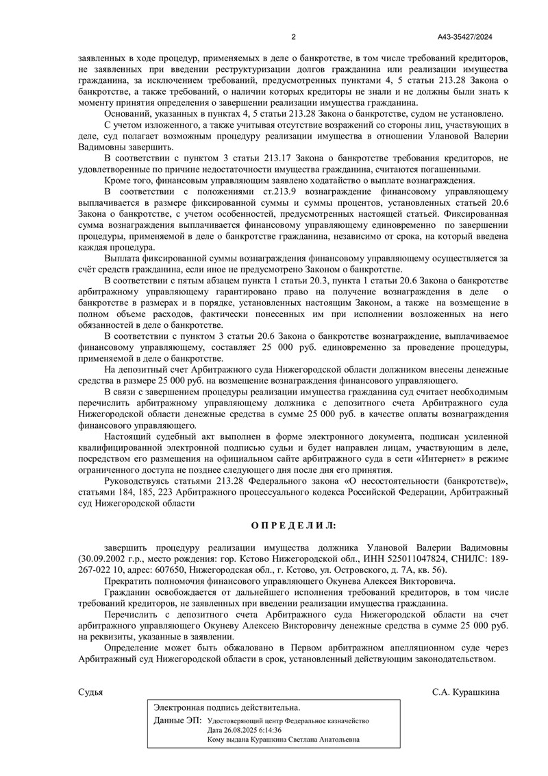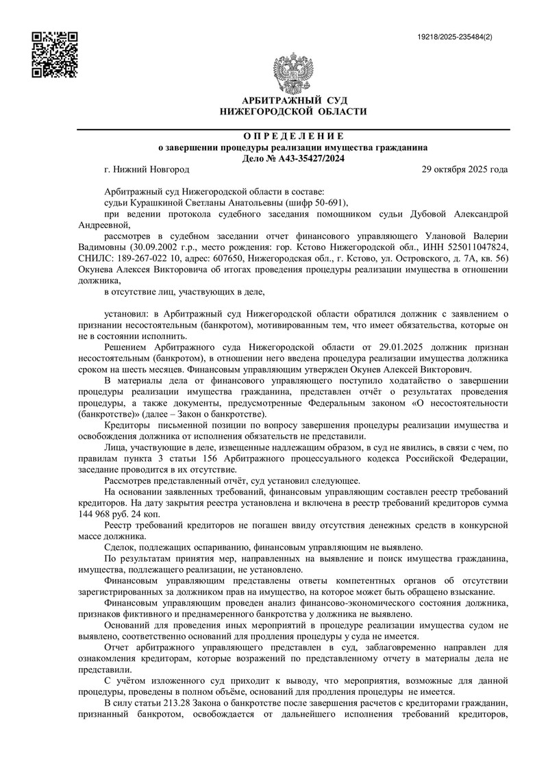 Арбитражный суд Нижегородской области завершил процедуру банкротства еще одного клиента компании ДОЛГАМ.НЕТ — дело № А43-35427/2024 стало очередным доказательством эффективности и юридической грамотности сопровождения нашей команды. Суд вынес определение о завершении процедуры реализации имущества, полностью освободив гражданина от долговых обязательств перед кредиторами.