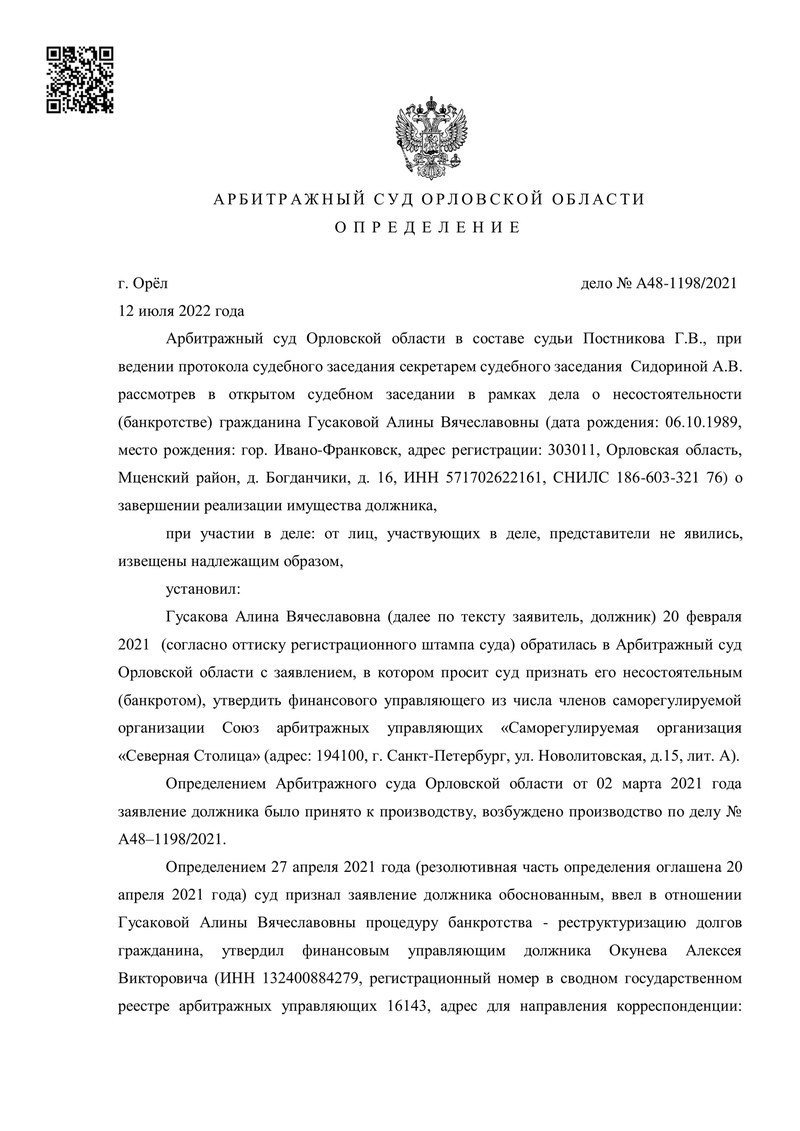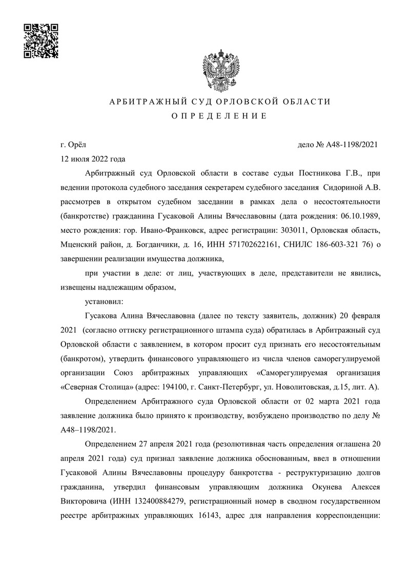 Арбитражный суд Орловской области вынес определение о завершении дела №А48-1198/2021 о банкротстве гражданина. Компания "ДОЛГАМ.НЕТ" с гордостью сообщает, что мы помогли еще одному своему клиенту освободиться от долгового бремени и начать новую главу финансовой жизни.
