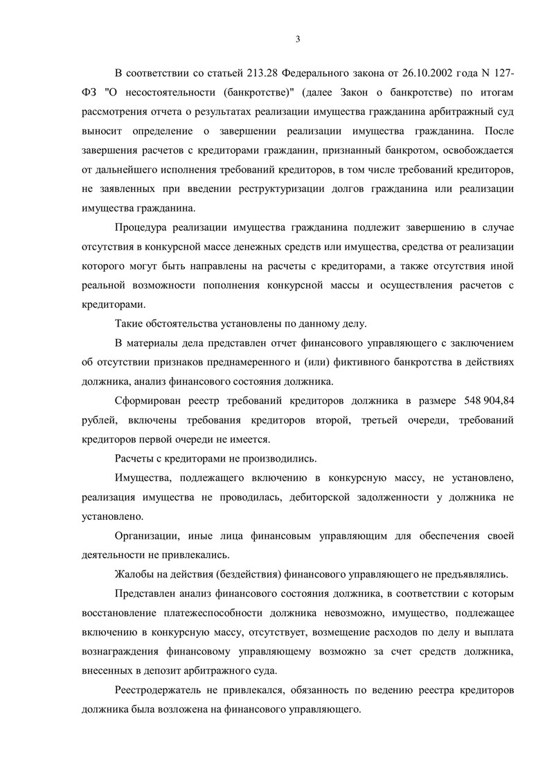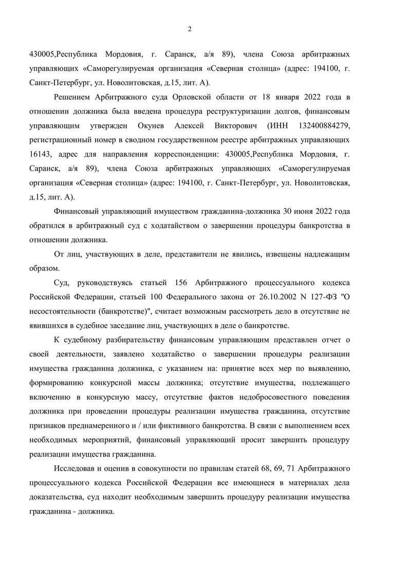 Финансовый управляющий провел все необходимые мероприятия, подтвердив отсутствие имущества, подлежащего включению в конкурсную массу, а также исключив возможность преднамеренного и фиктивного банкротства. Наш клиент в процедуре вел себя добросовестно и должным образом выполнил все требования суда и финансового управляющего.