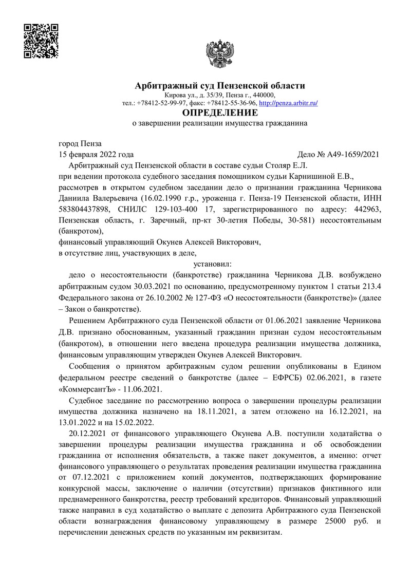 Мы продолжаем делиться успехами наших клиентов на сайте "ДОЛГАМ.НЕТ"! Арбитражный суд Пензенской области завершил процедуру реализации имущества гражданина и освободил его от долгов.