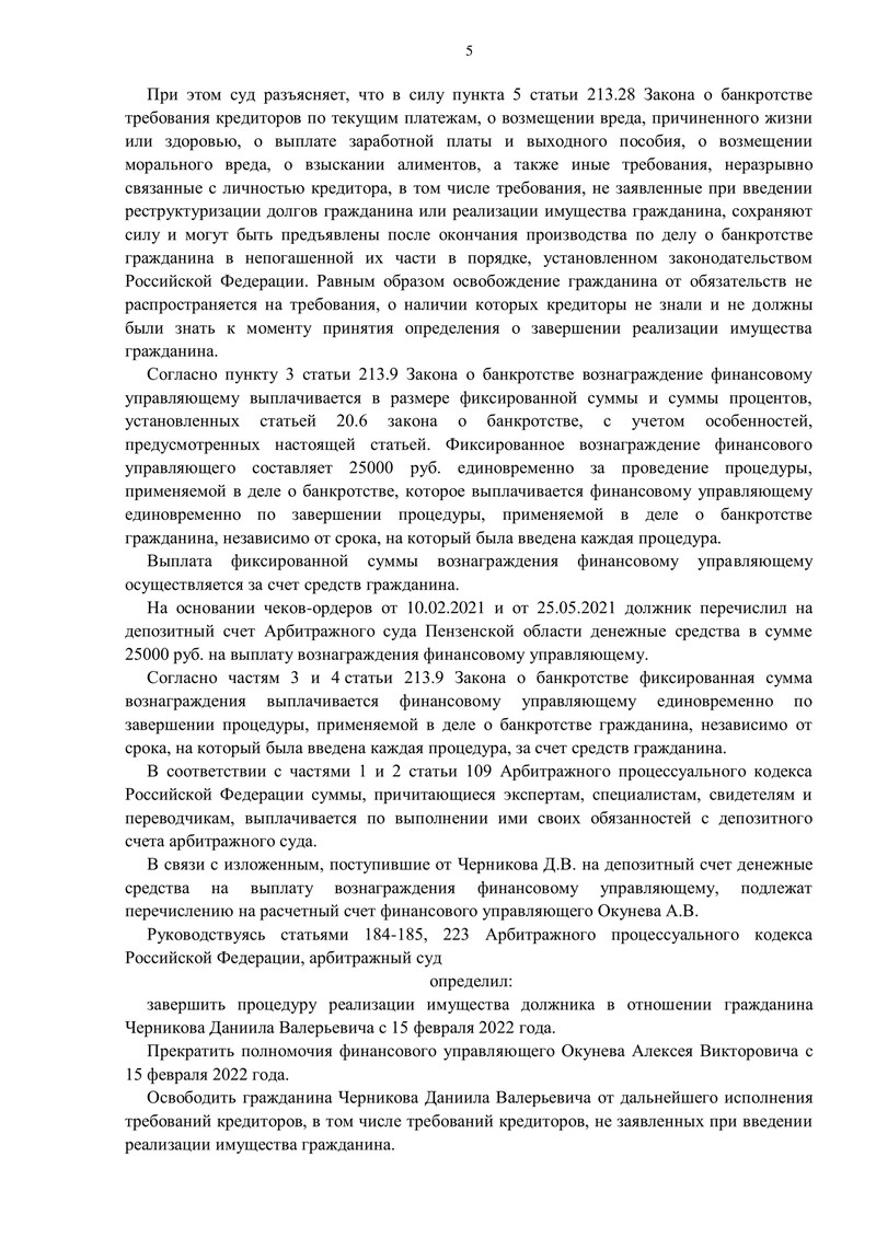 Определением суда от 15 февраля 2022 года процедура реализации имущества гражданина была завершена, а он освобожден от дальнейшего исполнения требований кредиторов, в том числе тех, которые не были заявлены при введении процедуры реализации имущества.