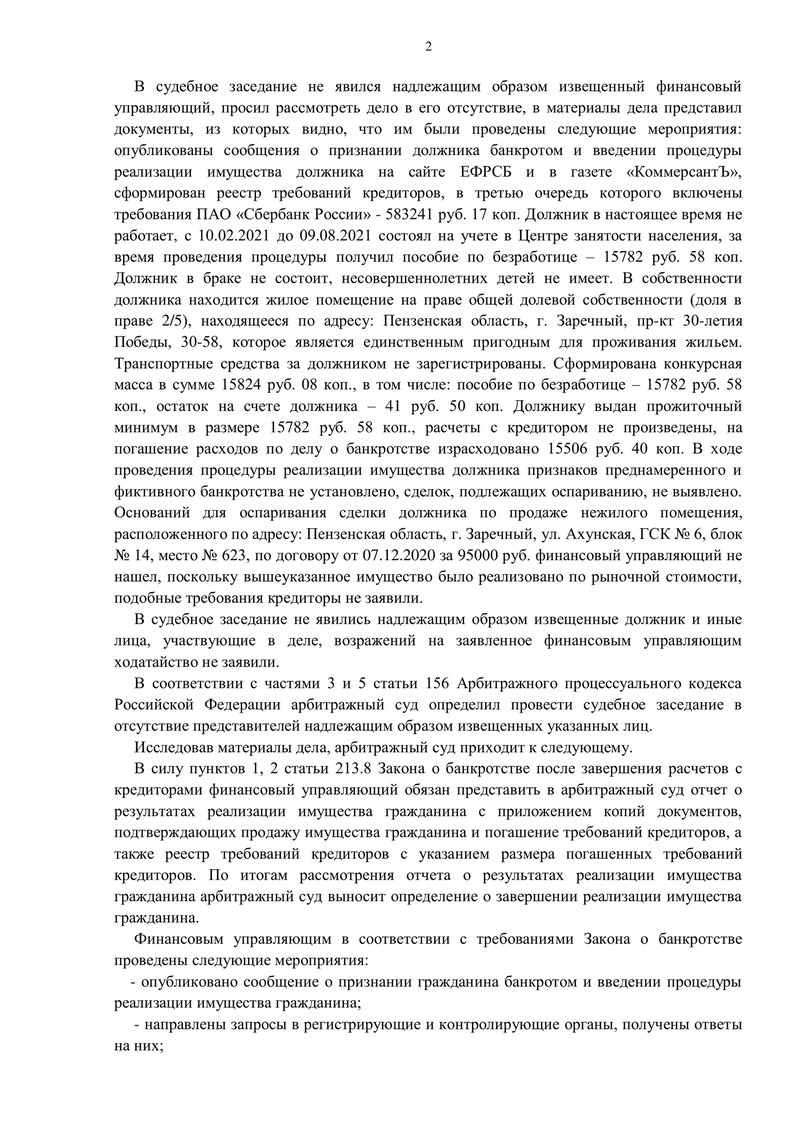 У нашего клиента были обязательства перед ПАО "Сбербанк России" на сумму 583 241 руб. 17 коп. Процедура банкротства началась 30 марта 2021 года, и уже 1 июня того же года суд признал заявление обоснованным, а гражданина несостоятельным.
