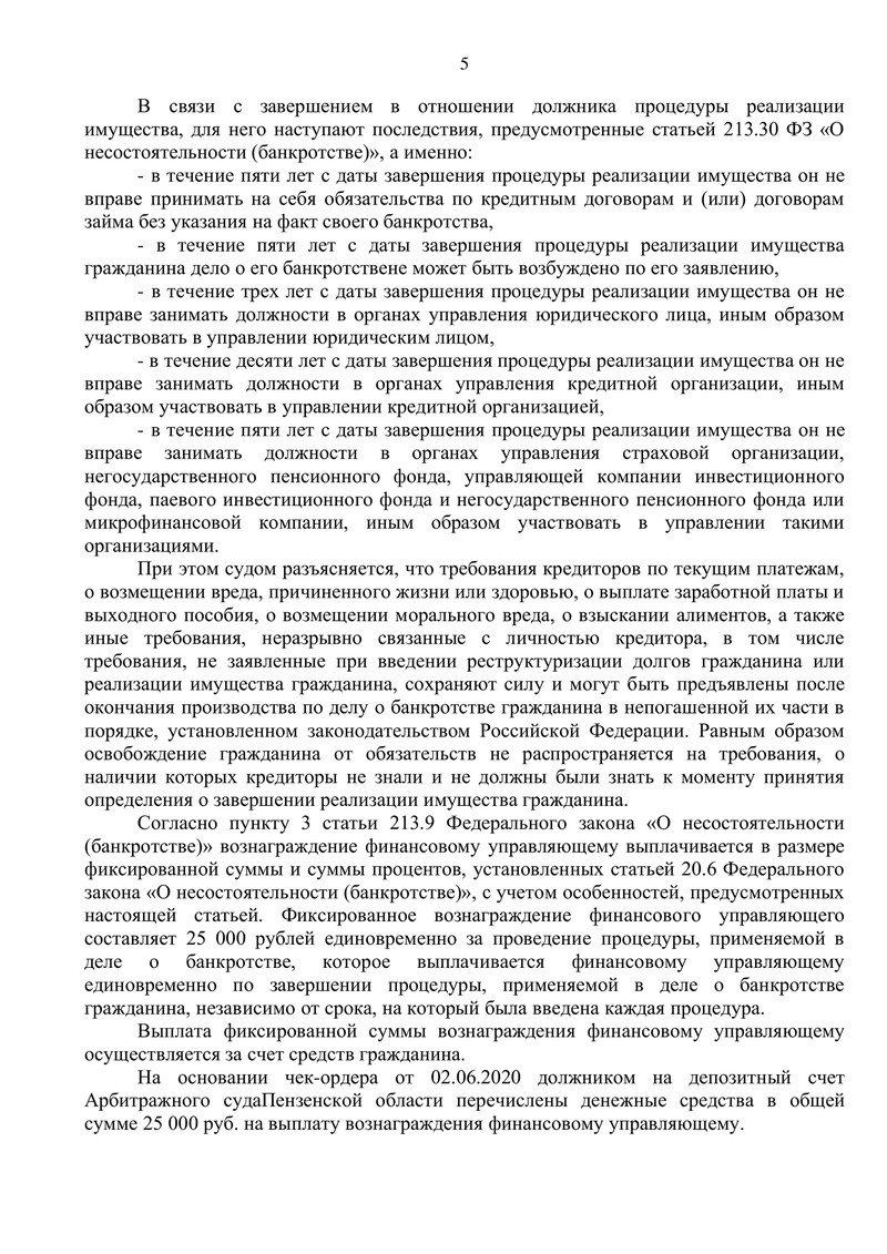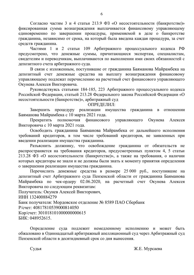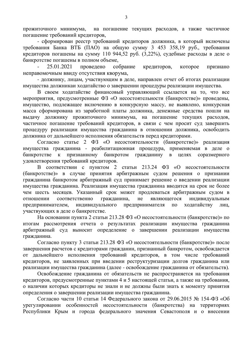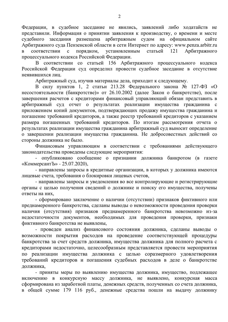 25 января 2021 года было проведено собрание кредиторов, которое, к сожалению, признано несостоявшимся из-за отсутствия кворума. Арбитражный суд изучил материалы дела и пришел к выводу о необходимости завершения процедуры реализации имущества.