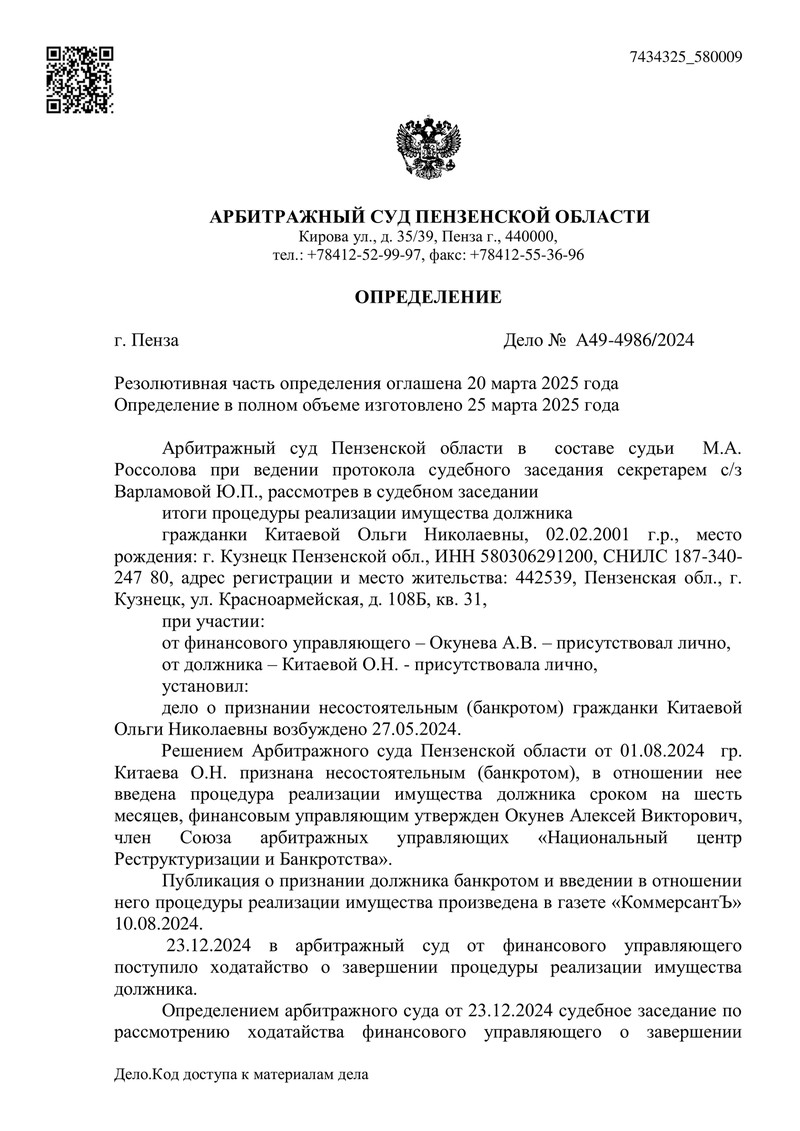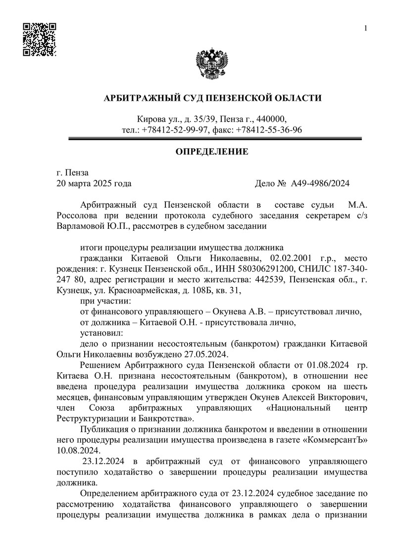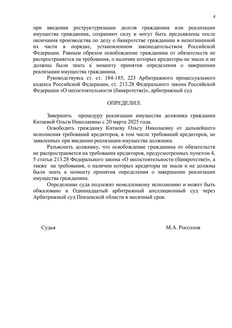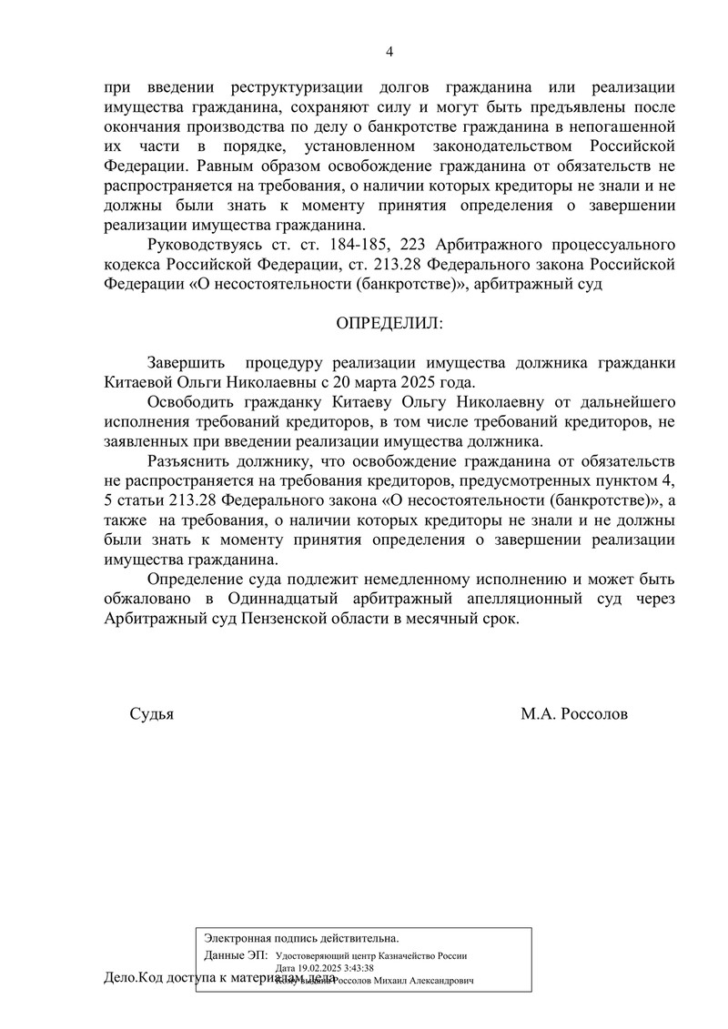 Арбитражный суд Пензенской области завершил процедуру реализации имущества в отношении клиента компании "ДОЛГАМ.НЕТ". Рассмотрев отчет финансового управляющего, материалы дела и все обстоятельства процедуры, суд удовлетворил ходатайство о завершении банкротства и освободил должника от дальнейшего исполнения требований кредиторов.