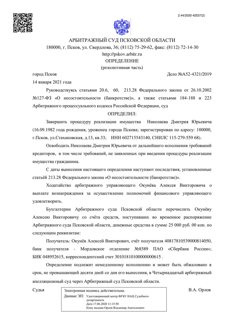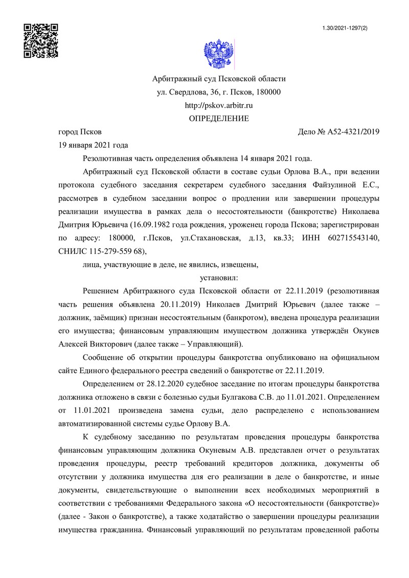 Компания "ДОЛГАМ.НЕТ" продолжает радовать клиентов победами. Этот раз в Арбитражном суде Псковской области успешно завершилось дело №А52-4321/2019.