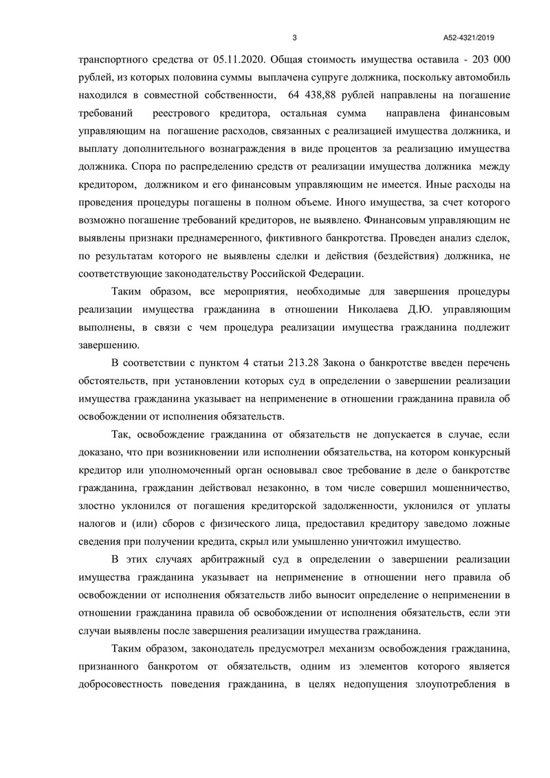 Финансовый управляющий проделал огромную работу по выявлению имущества, принадлежащего должнику, и его реализации. В конкурсную массу среди всего прочего был включен автомобиль, который был продан по цене 203 000 рублей.