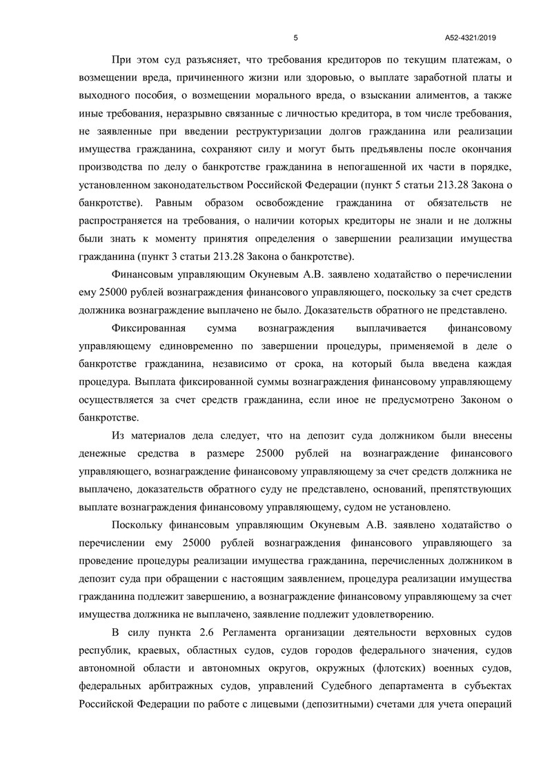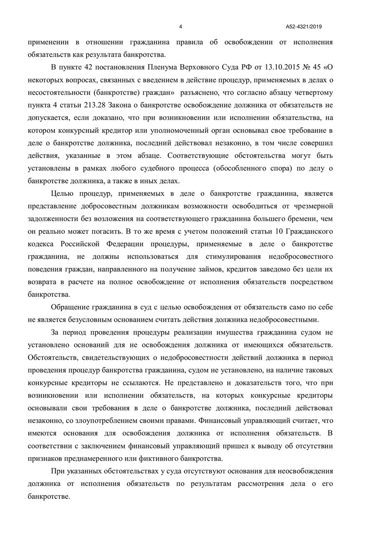 Финансовый управляющий не обнаружил признаков преднамеренного или фиктивного банкротства, что позволило освободить нашего клиента от дальнейшего исполнения долговых обязательств. Стоит отметить, что все мероприятия проведены были прозрачно и корректно, согласно требованиям Федерального закона №127-ФЗ "О несостоятельности (банкротстве)".