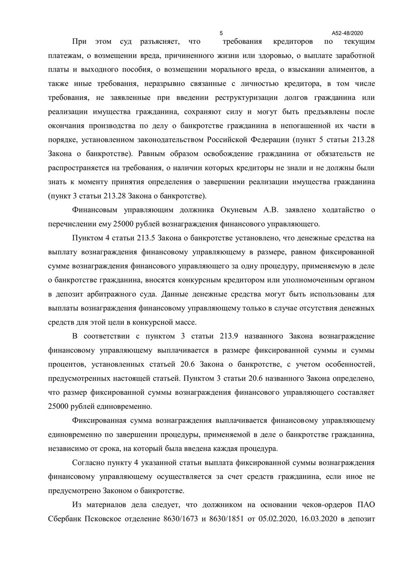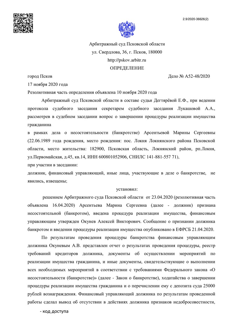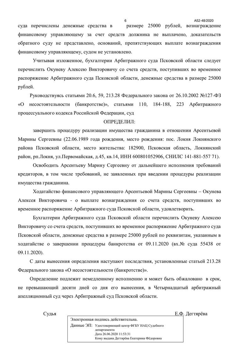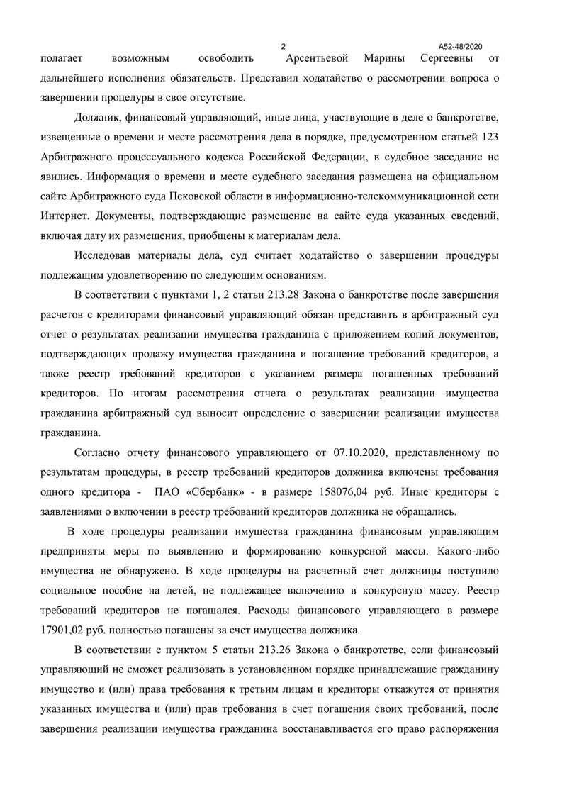 Дело №А52-48/2020 рассматривалось в Арбитражном суде Псковской области. Финансовый управляющий провел все необходимые мероприятия и предоставил отчет о результатах своей работы.