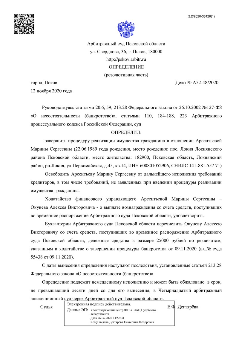 Мы рады поделиться историей успеха еще одного нашего клиента, который благодаря юридической компании "ДОЛГАМ.НЕТ" смог освободиться от гнета долгов. Арбитражный суд Псковской области завершил процедуру банкротства, освободив гражданина от дальнейшего исполнения обязательств перед кредиторами.