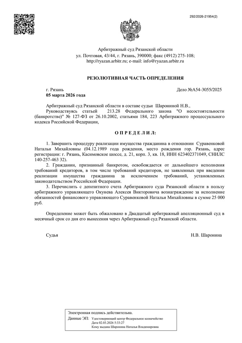 05 марта 2026 года Арбитражный суд Рязанской области вынес определение о завершении процедуры реализации имущества гражданина. Для нашего клиента это означает главное: дело № А54-3055/2025 доведено до финальной точки, а по его итогам суд применил предусмотренное законом освобождение от дальнейшего исполнения требований кредиторов.