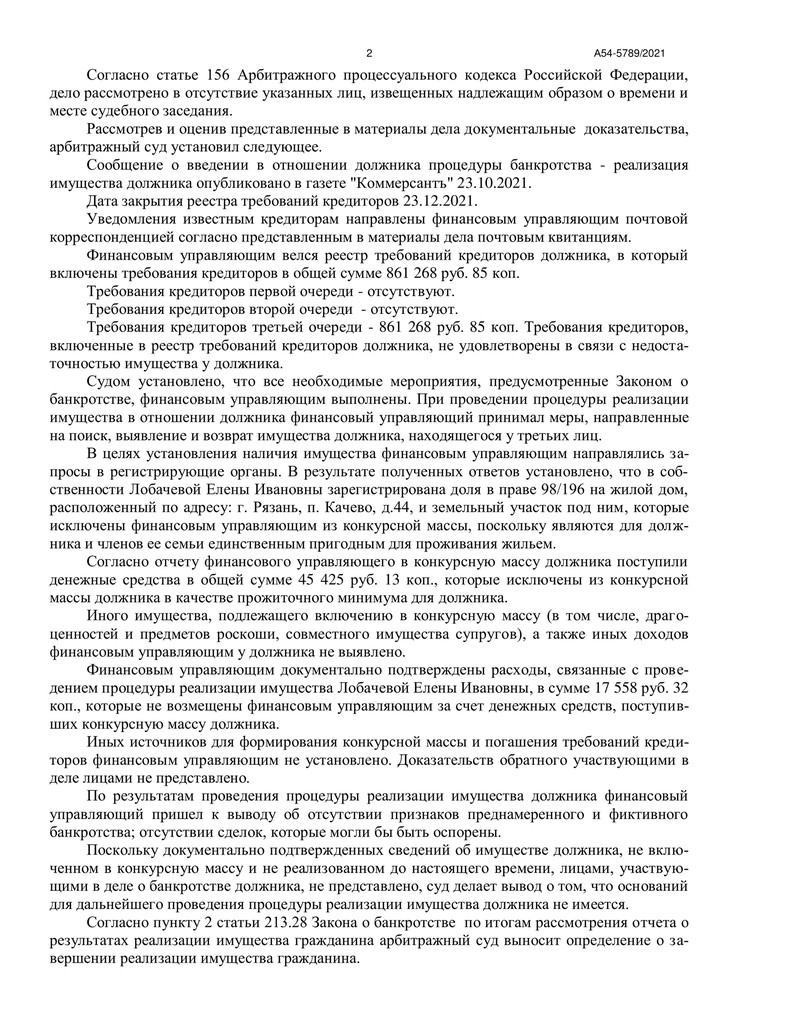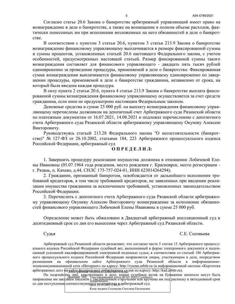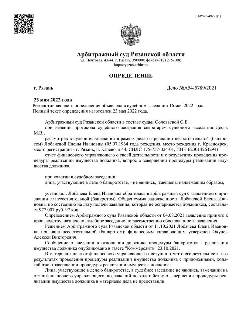 Очередной успех компании "ДОЛГАМ.НЕТ"! Наш клиент прошел процедуру банкротства и освободился от долговых обязательств. Дело №А54-5789/2021 рассматривалось в Арбитражном суде Рязанской области, и 16 мая 2022 года было вынесено определение о завершении процедуры реализации имущества должника.