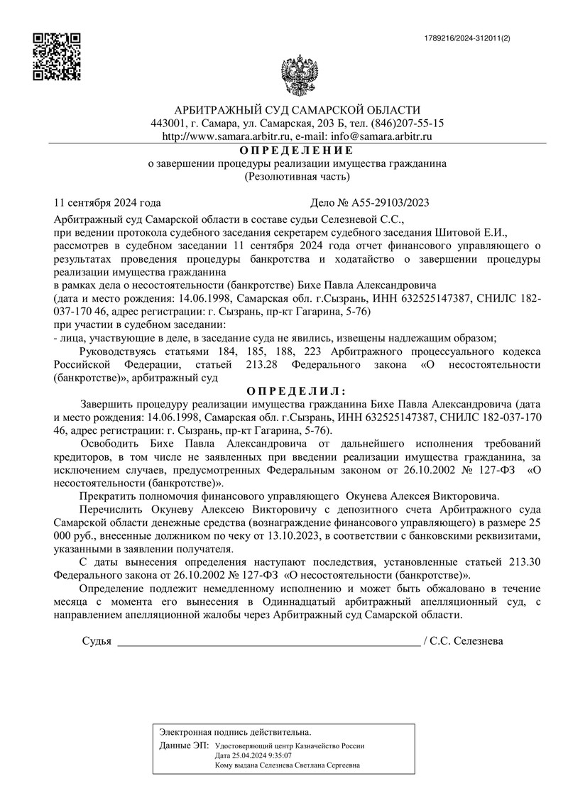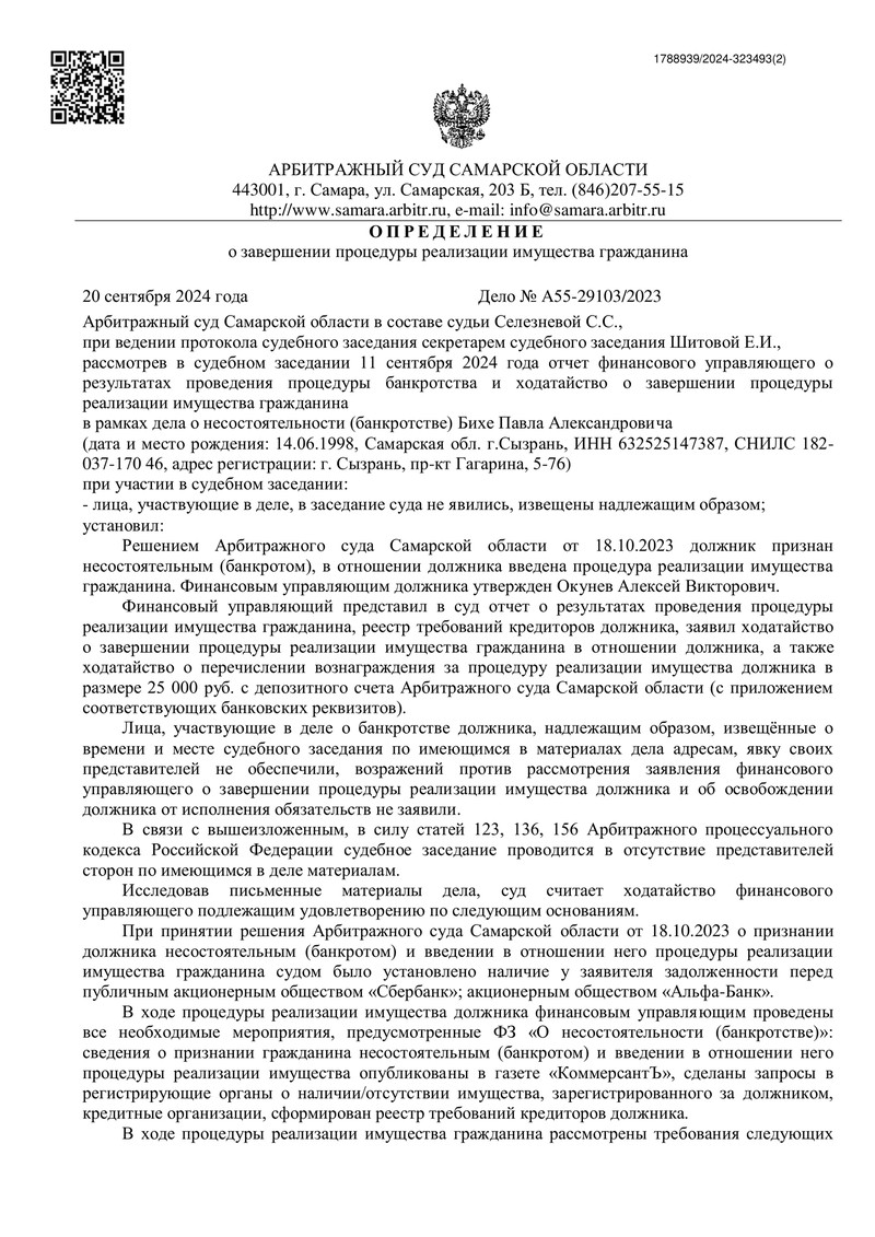 11 сентября 2024 года в ходе судебного заседания было принято важное определение: суд постановил завершить процедуру реализации имущества нашего клиента. В итоге он был полностью освобожден от дальнейшего исполнения требований кредиторов, включая те обязательства, которые не были заявлены вовремя.