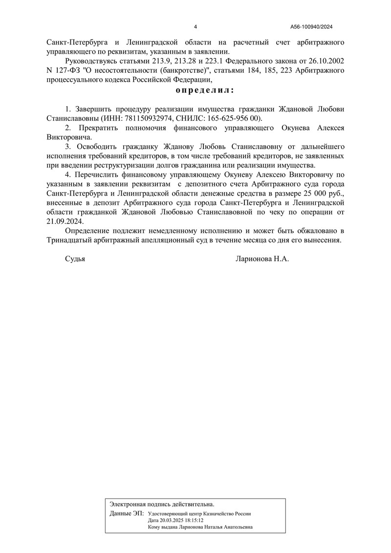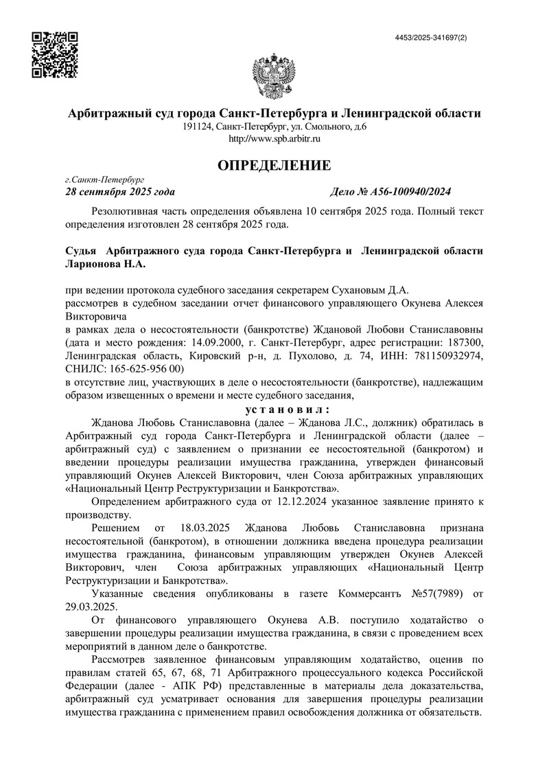 28 сентября 2025 года Арбитражный суд города Санкт-Петербурга и Ленинградской области завершил дело №А56-100940/2024 по банкротству физического лица. Благодаря слаженной работе команды "ДОЛГАМ.НЕТ" еще один наш клиент избавился от долгового бремени и вернулся к полноценной жизни!