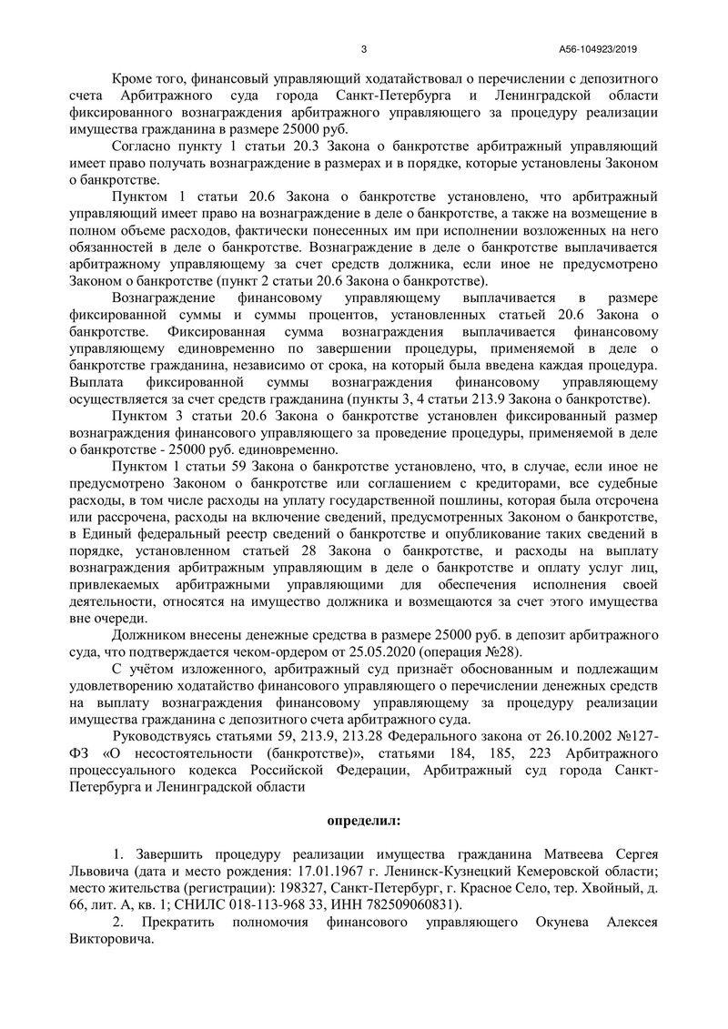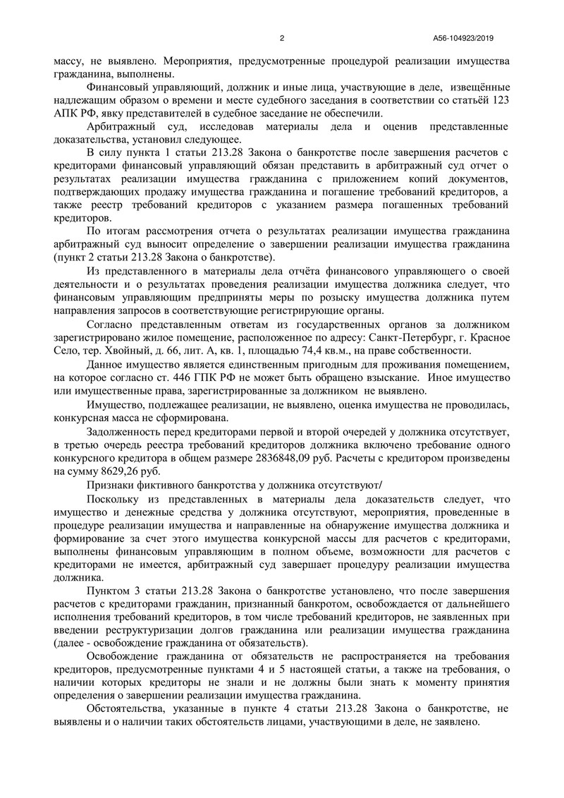 Процедура реструктуризации долгов была введена 20 ноября 2019 года и информация об этом была опубликована в газете "Коммерсантъ" от 30 ноября 2019 года. В мае 2020 года было принято решение о переходе к процедуре реализации имущества. Согласно представленным отчетам, за нашим клиентом не числилось никакого имущества, кроме единственного пригодного для проживания жилья, на которое в соответствии с действующим законодательством не может быть обращено взыскание.