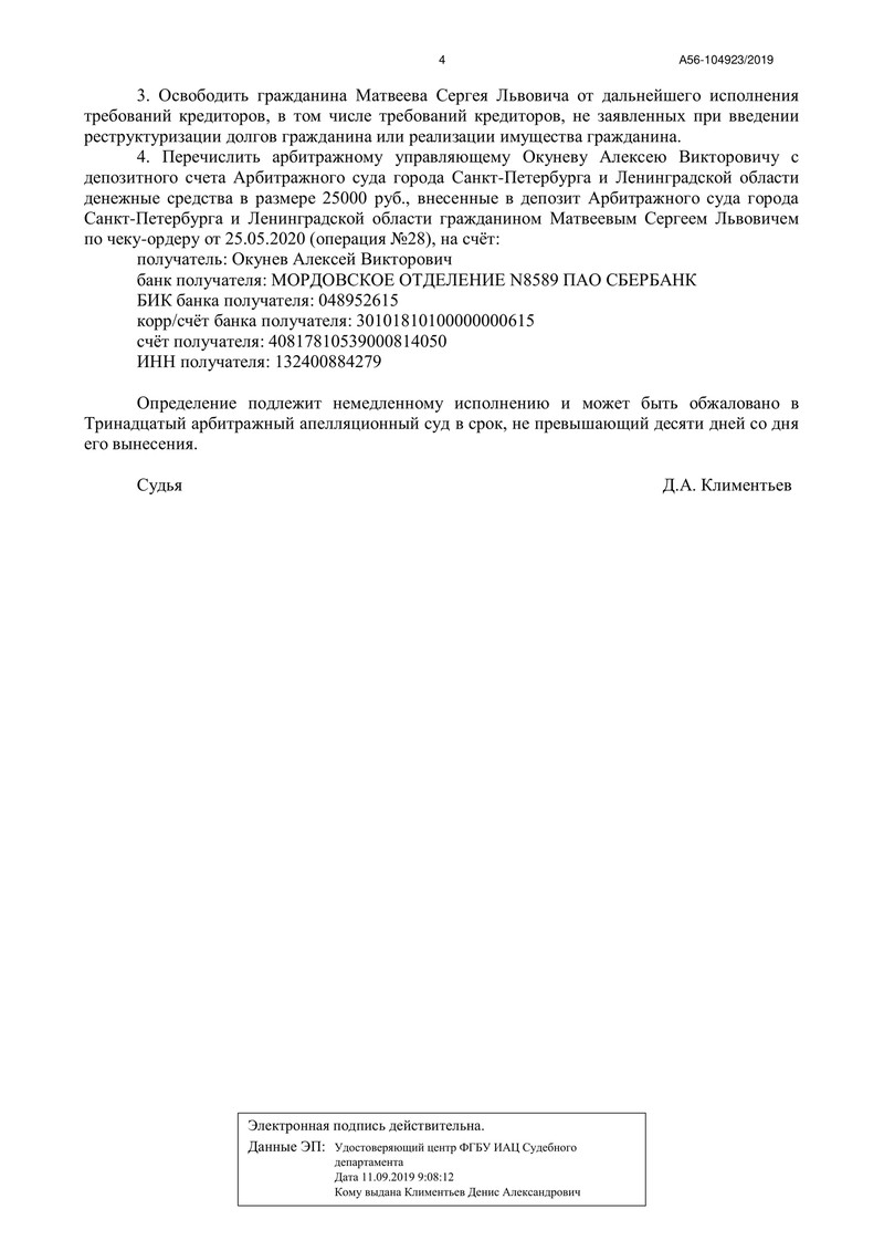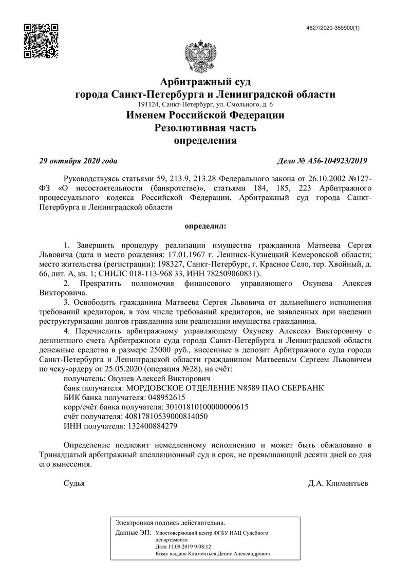 На основании статьи 213.28 Закона о банкротстве наш клиент был освобождён от дальнейшего исполнения обязательств перед кредиторами. Это решение подлежит немедленному исполнению и может быть обжаловано в течение десяти дней.
