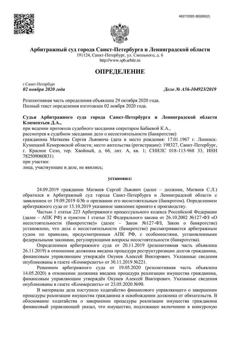 Еще один клиент компании "ДОЛГАМ.НЕТ" обрёл долгожданную финансовую свободу! Арбитражный суд города Санкт-Петербурга и Ленинградской области завершил процедуру реализации имущества нашего клиента, избавив его от многомиллионного долга. Давайте разберём это дело подробнее.