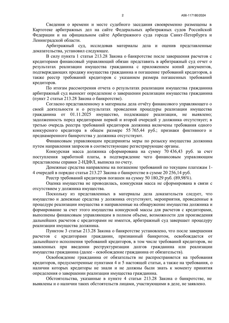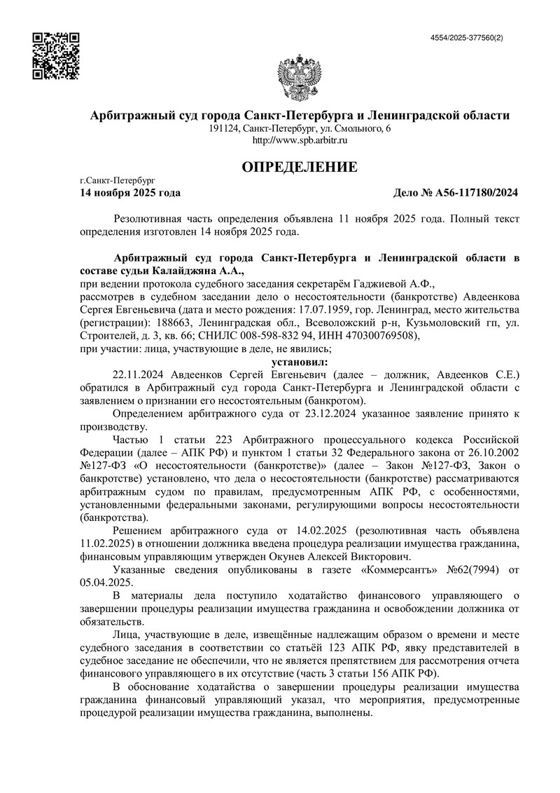 14 ноября 2025 года Арбитражный суд города Санкт-Петербурга и Ленинградской области вынес определение о завершении процедуры реализации имущества и освобождении нашего клиента от всех обязательств перед кредиторами. Это ещё одна успешная история на счету компании "ДОЛГАМ.НЕТ"!