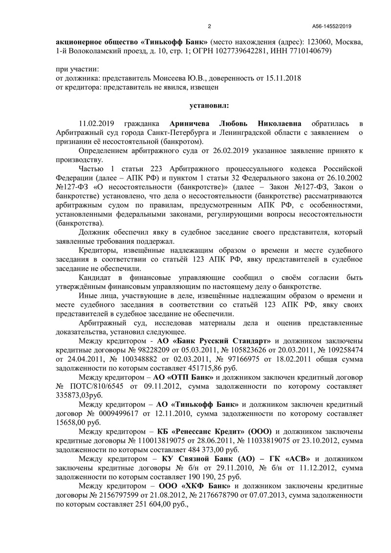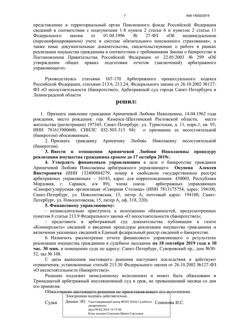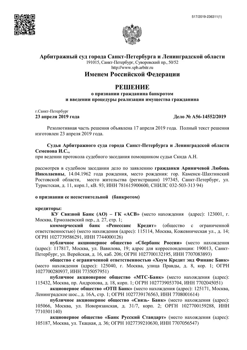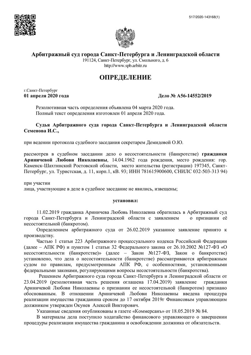 Арбитражный суд города Санкт-Петербурга и Ленинградской области своим определением освободил нашего клиента от дальнейшего исполнения обязательств перед кредиторами, предоставив ему возможность начать новую жизнь без долговой нагрузки!