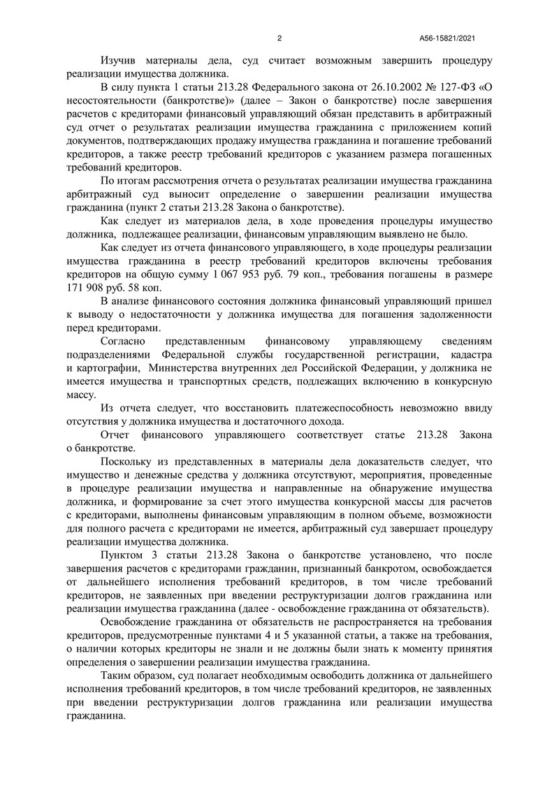 Наш клиент обратился в суд с заявлением о признании его банкротом, и уже 5 августа 2021 года суд признал его несостоятельным. В процедуре реализации имущества должника участвовал финансовый управляющий, который профессионально и грамотно справился с возложенными на него обязанностями.