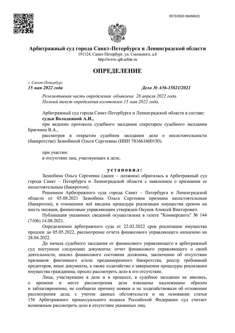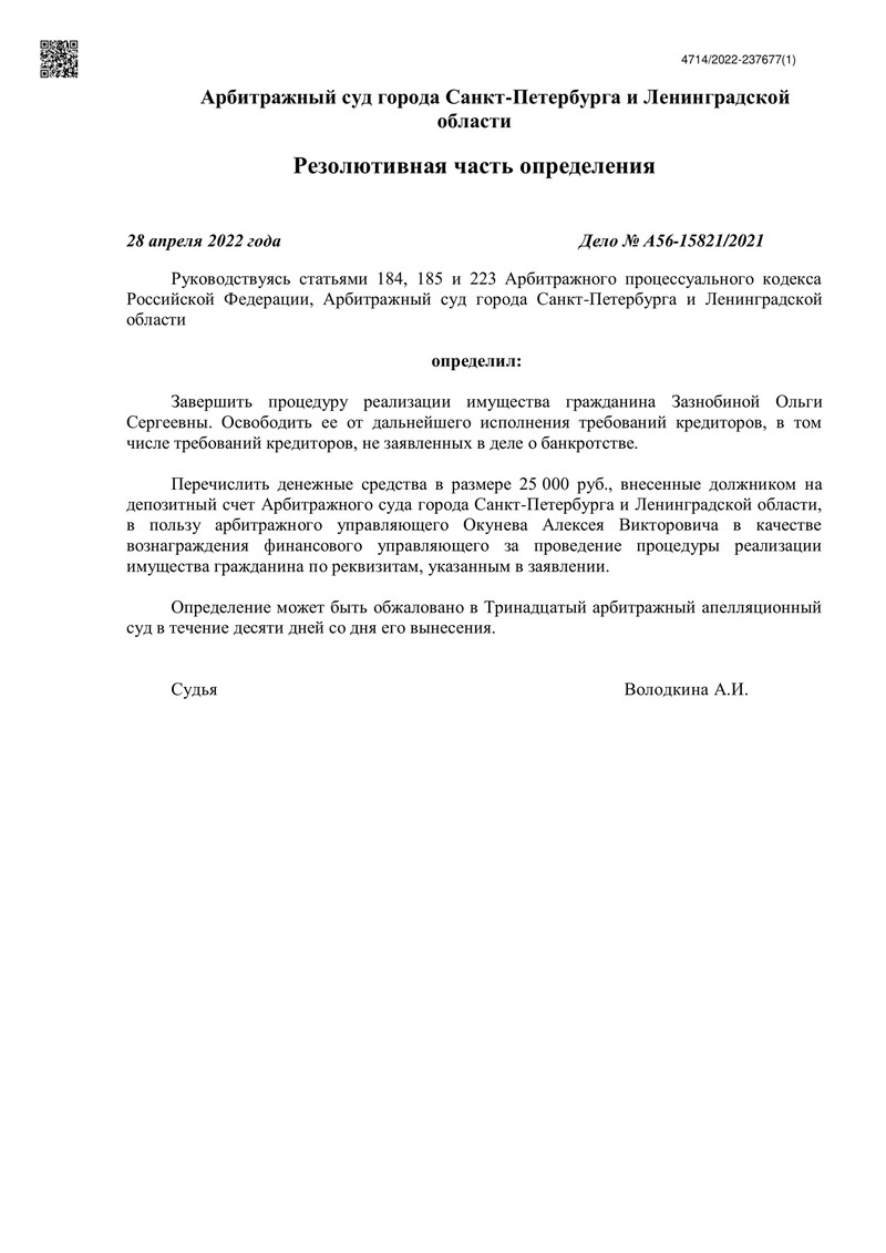 Ещё один клиент компании "ДОЛГАМ.НЕТ" получил долгожданное определение о завершении процедуры банкротства! Арбитражный суд города Санкт-Петербурга и Ленинградской области вынес решение в пользу должника. Это очередной пример успешной работы нашей компании, которая помогает людям избавиться от долгового бремени и начать новую жизнь.