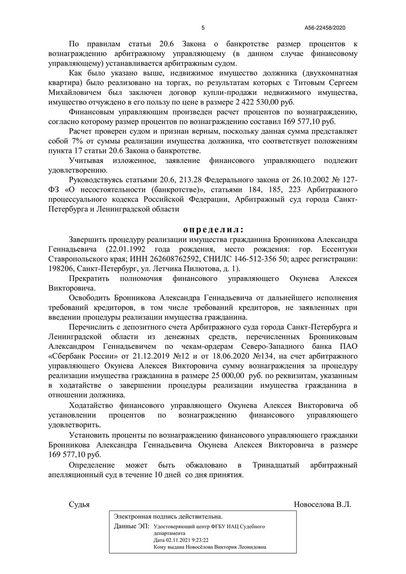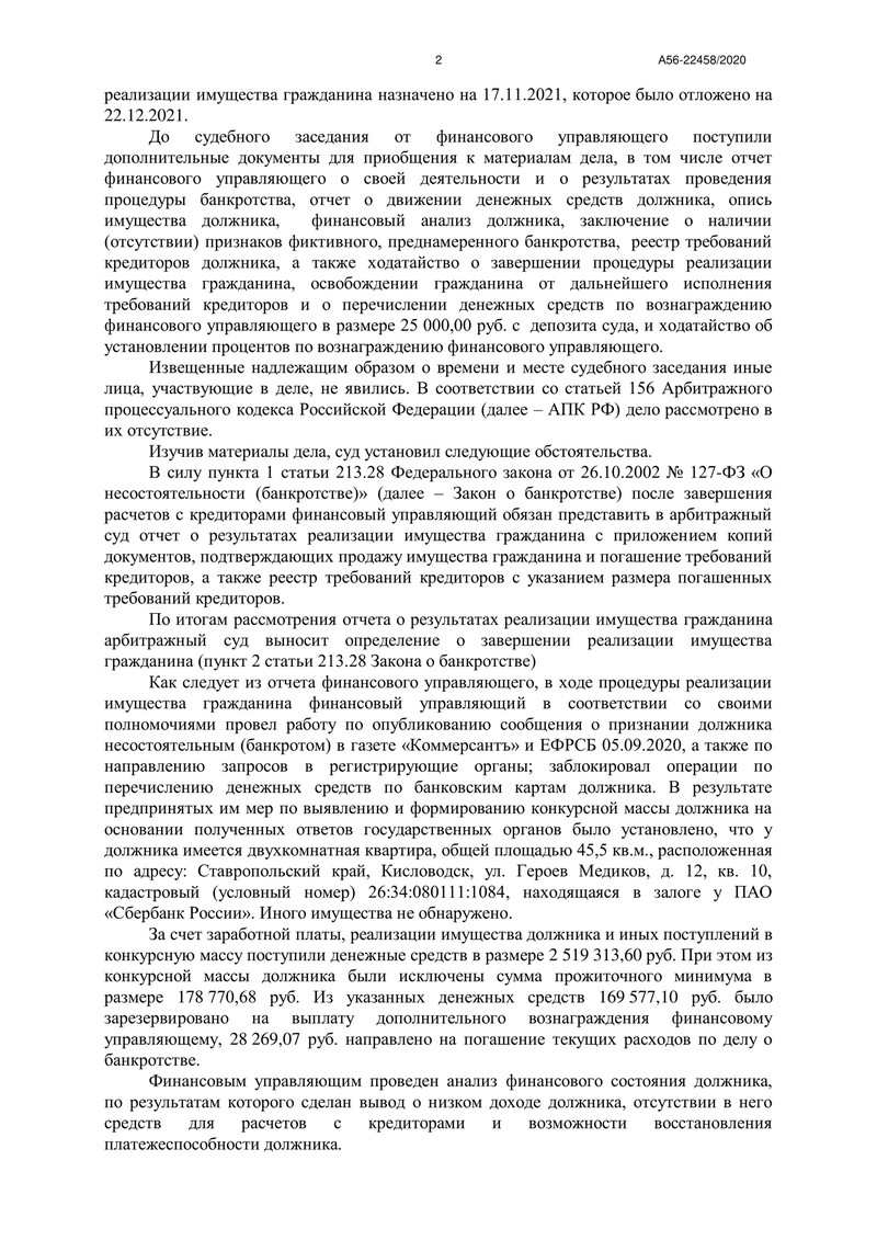 Согласно резолютивной части определения, наш клиент был освобожден от дальнейшего исполнения требований кредиторов, в том числе тех, которые не заявили свои требования при введении процедуры реализации имущества. Это означает, что клиент больше не обязан выплачивать свои долги.