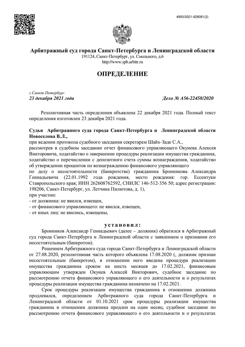 Мы рады сообщить о новом успехе в копилке компании "ДОЛГАМ.НЕТ"! 22 декабря 2021 года Арбитражный суд города Санкт-Петербурга и Ленинградской области вынес определение по делу №А56-22458/2020, которое освободило нашего клиента от долгов и кредитных обязательств. Это очередное подтверждение эффективности процедуры и нашего профессионализма.